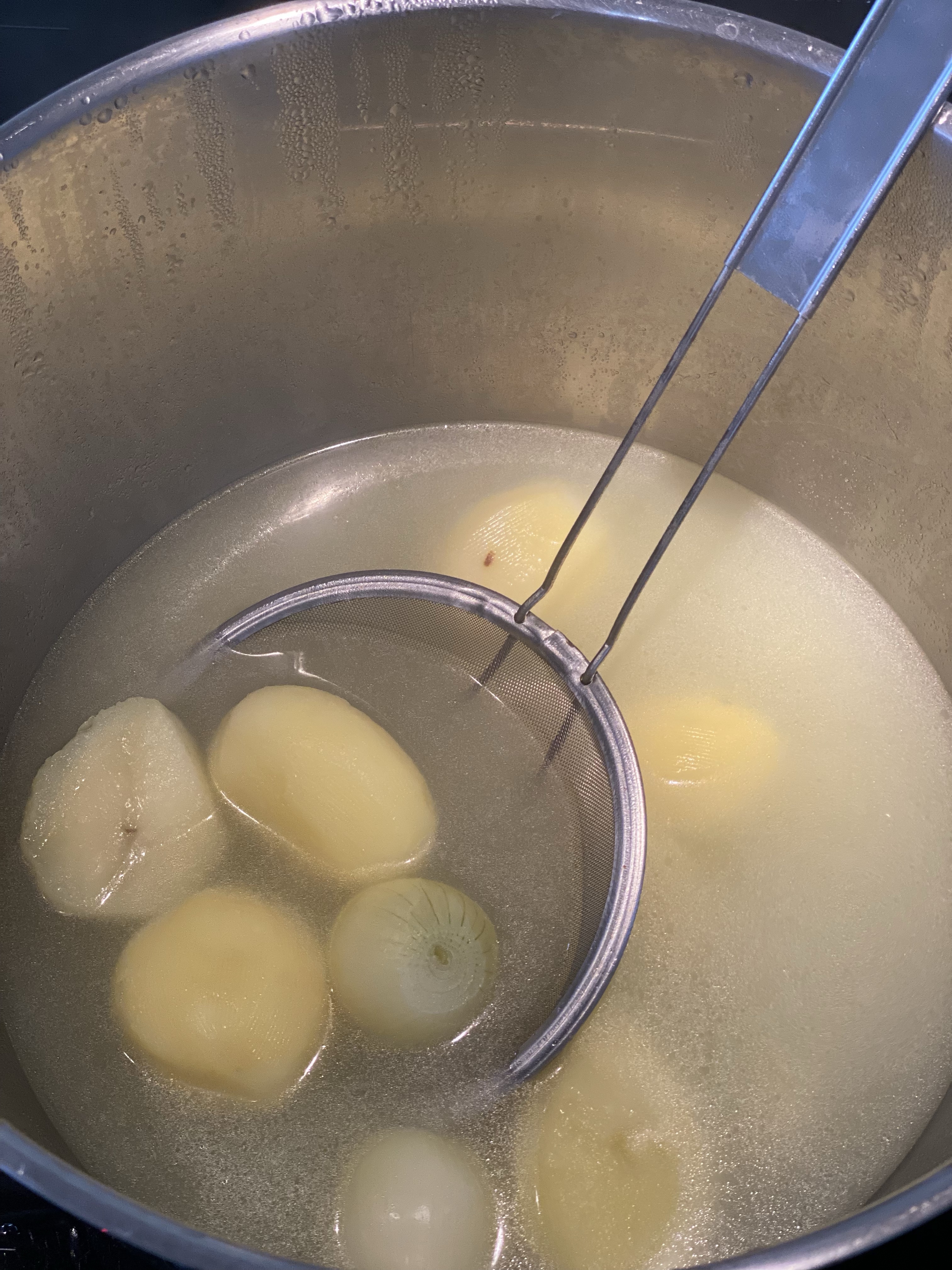 - Retirez les pommes de terre, les oignons et l’ail à l’aide d’une écumoire, tout en conservant l’eau de cuisson, maintenue à ébullition. Écrasez-les. Remettez les pommes de terre écrasées dans l’eau de cuisson. Mélangez.