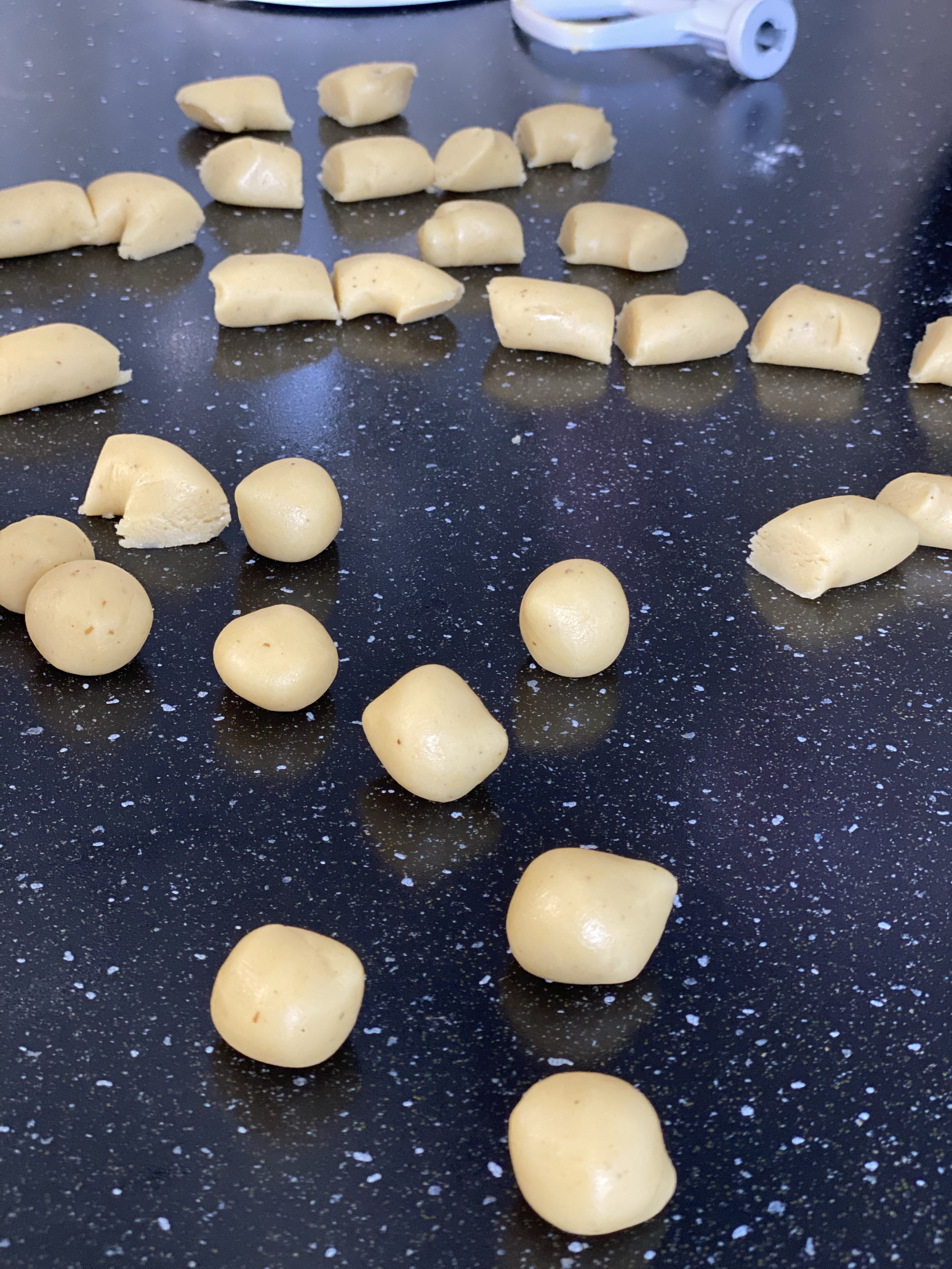 5. Formez de petites boules au creux de la main puis d’enrobez la moitié de la sphère de sucre granulé.