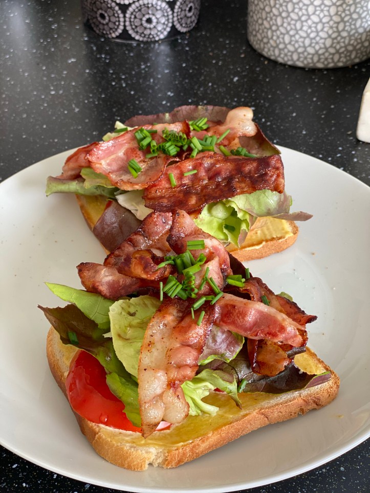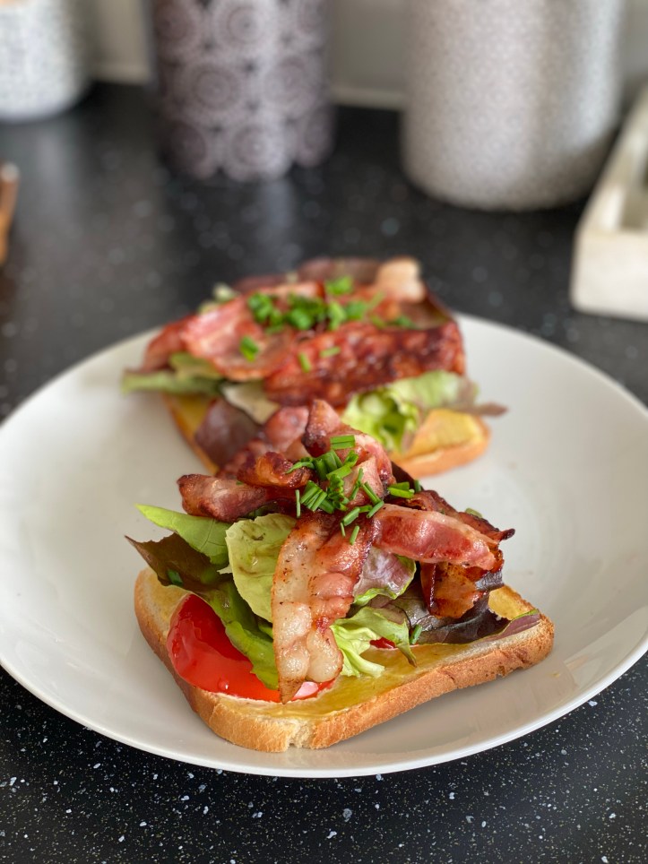 - Pour composez le BLT, déposez une feuille de salade, une tranche de tomate sur chaque tranche de pain et ajoutez deux tranches de bacon. Ciselez quelques brins de ciboulette.
