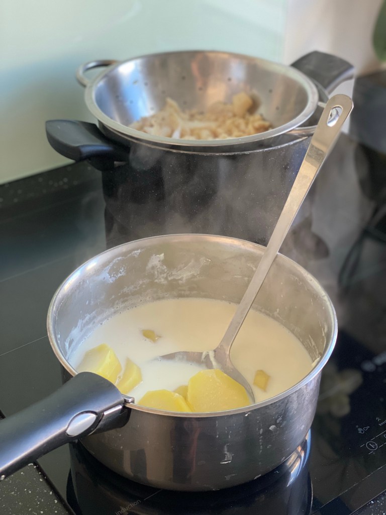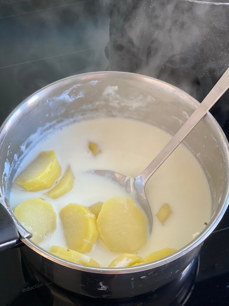 - Pelez et coupez les pommes de terre en rondelles pas trop fines, couvrez-les à hauteur de lait, ajoutez une feuille de laurier et faites-les cuire 10 à 15 minutes, le temps qu’elles se laissent assez facilement transpercer par la lame d’un couteau. Retirez-les a l’aide d’une écumoire. Réservez le lait.