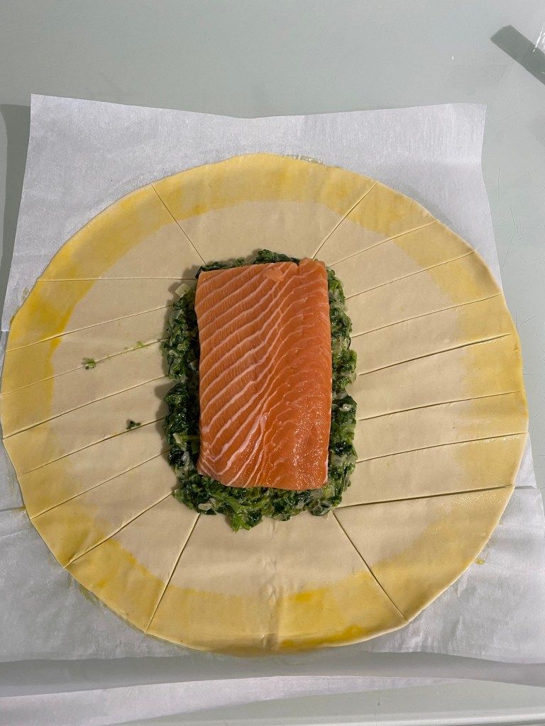 - Étalez votre pâte feuilletée. Déposez les épinards au centre en formant un grand rectangle. Assaisonnez selon vos goûts. Par-dessus, déposez les filets de saumon.