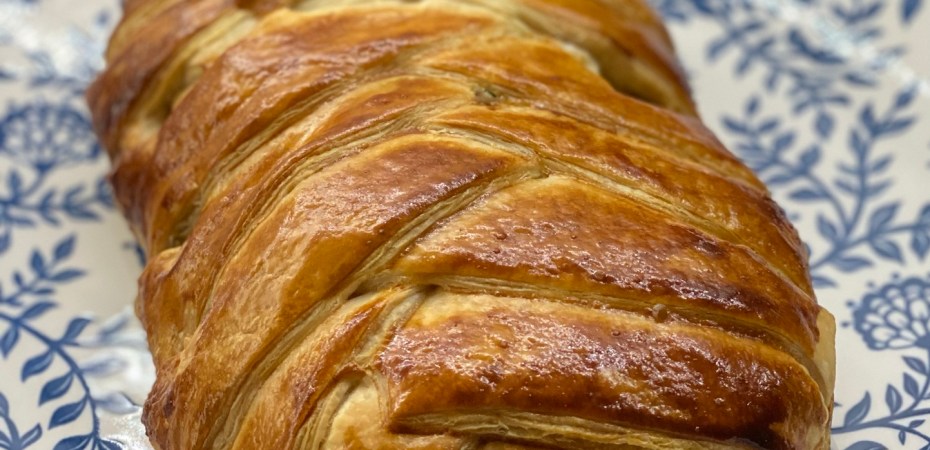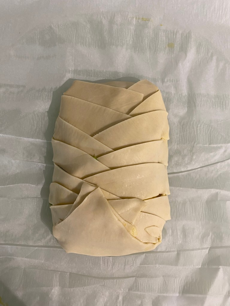 - Découpez les côtés de la pâte feuilletée en bandes d’environ 1,5 cm. Refermez-les sur la garniture pour former une tresse.
