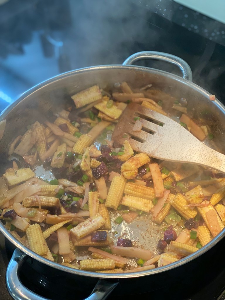 - Ajoutez la carotte, les oignons nouveaux, les épis de maïs, les pousses de bambous et le gingembre.