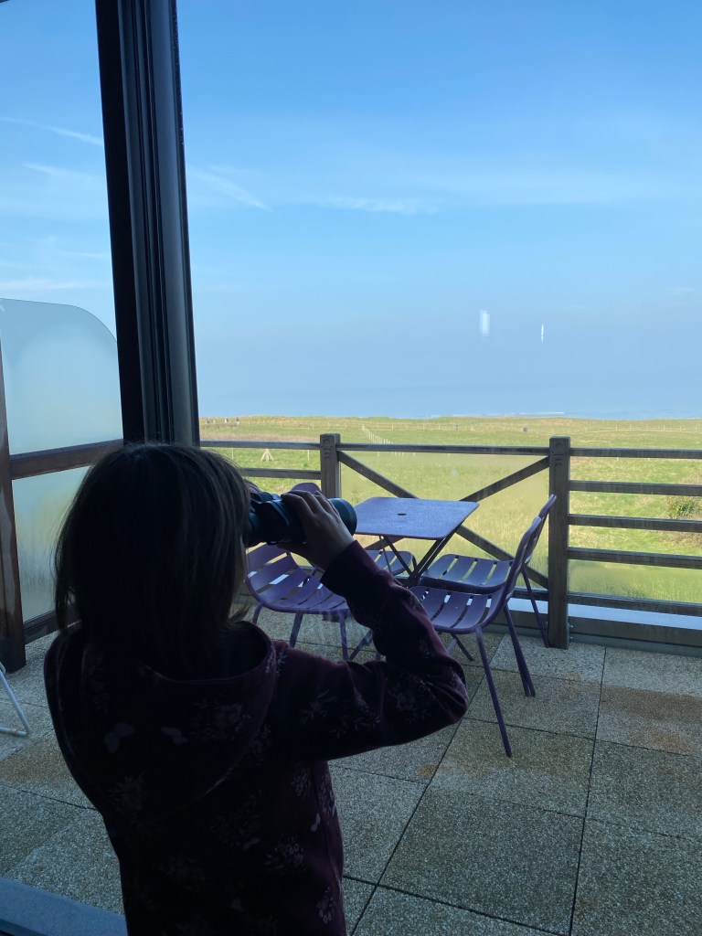 La vue est superbe et nous avons apprécié les jumelles mises à disposition pour observer les oiseaux et les lapins de garenne à proximité !