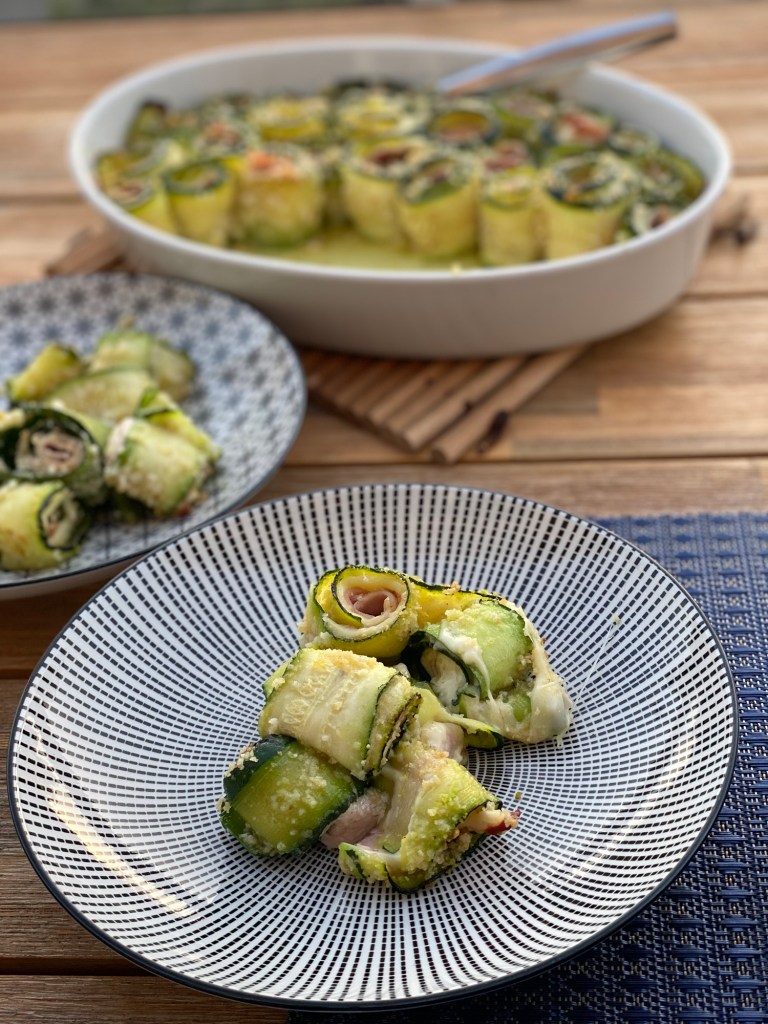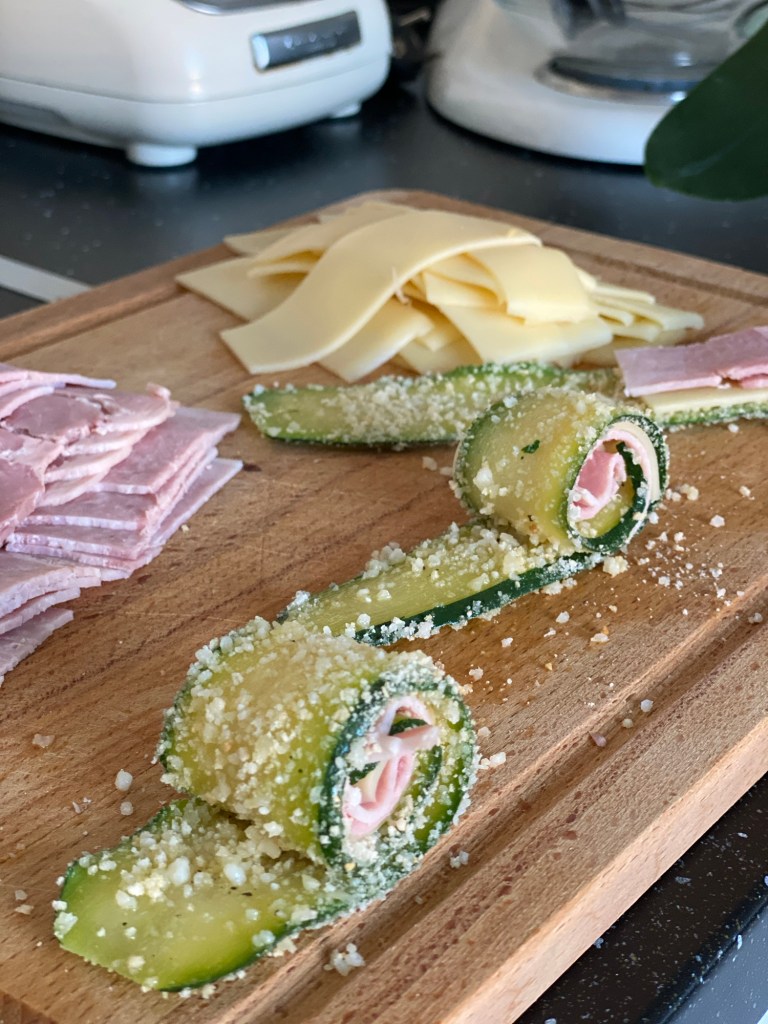 9. Enfournez à 200° et laisser cuir jusqu’à l’obtention d’une coloration dorée. Le fromage doit être fondu. Cela prendra environ 10 minutes. Une fois cuits, sortez les rouleaux de courgettes du four et servez.