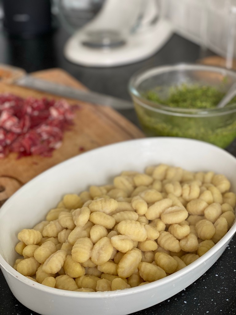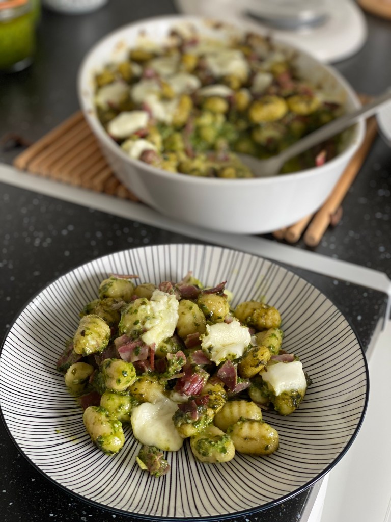 - Déposez les gnocchi dans un plat à grattin puis ajoutez le pesto. Coupez le speck en petit morceaux.
