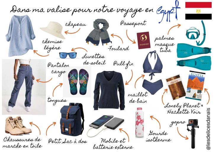 En Egypte, la météo annoncée est plutôt clémente. Sachant qu’à cette période de l’année les température avoisine 30 °C, il faut bien se préparer. Nous allons apporter des vêtements de randonnée pour nos balades dans les temples et des ténues d’été pour notre séjour au bord de la Mer Rouge.