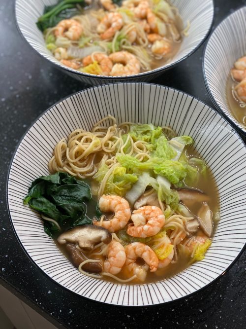 - Portez le bouillon à ébullition et ajoutez les vermicelles, le chou et les champignons. Laissez cuire 5 minutes. Lorsque les vermicelles sont cuits, ajoutez les épinards et les crevettes. En quelques secondes, les feuilles d’épinard sont cuites.