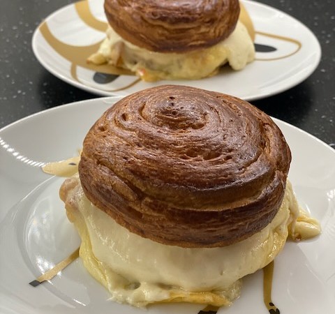 C’est un petit pain rond et feuilleté qui a la texture d’un croissant et la forme d’un burger. On l’aime pour son croustillant et son goût. Aujourd’hui on le transforme comme un croissant fourré au jambon une variation gourmande du croque-monsieur pour un repas rapide et facile à préparer.
