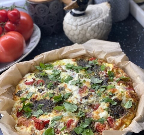 On profite des dernières tomates pour préparer une frittata avec le pesto que nous avons réaliser la semaine dernière. C’est une recette simple et facile à réaliser qui plait à tout le monde. Pour donner plus de goût à ce plat italien, j’utilise de la burratina fumée.