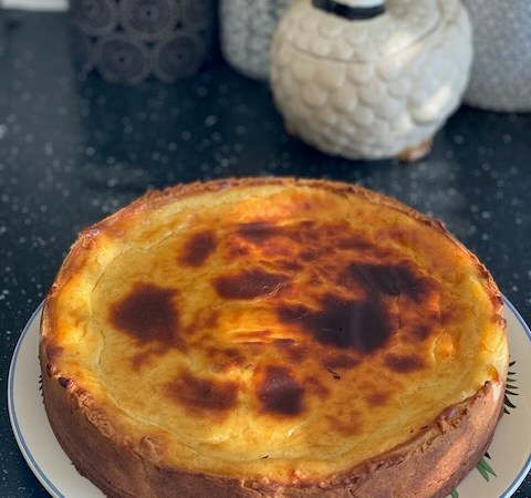 - Versez la crème sur la pâte et enfournez sans attendre pour 10 minutes pour saisir le fond, Descendez ensuite la température du four à 180°C et continuez la cuisson pour encore 40 minutes.