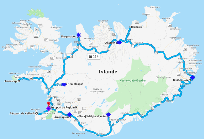 Notre parcours : Reykjavik – Cercle d’Or – Skógar – Vik – Jökulsarlon – Breiðdalsvík – les Fjords de l’est – Akureyri – Husavik – Mývatn – Fjallagisting – Hraunfossar – Skorradalshreppur – Snaefellsnes – Reykjavik – Reykjanes.