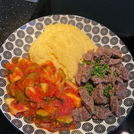 Steak aux courgettes & polenta au cheddar